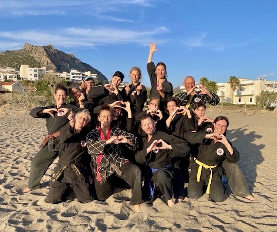 Unter der Leitung von Sabomnim Lidija Kovacic kamen 14 Teilnehmer und Teilnehmerinnen beim 17. Shinson Hapkido Lehrgang auf Kreta zusammen, bei sonnigem blauem oder sternklarem Himmel und wunderbarer Landschaft, herausgefordert und geborgen - ein Ort und eine Zeit, um zu ahnen und zu spüren. Dieser Lehrgang ging deutlich über reine neue Techniklehre hinaus. Es war eine Reise durch die Vielfalt dieser Kampfkunst und schließlich eine Reise zu sich selbst. Himmel, Erde, Mensch waren eins.